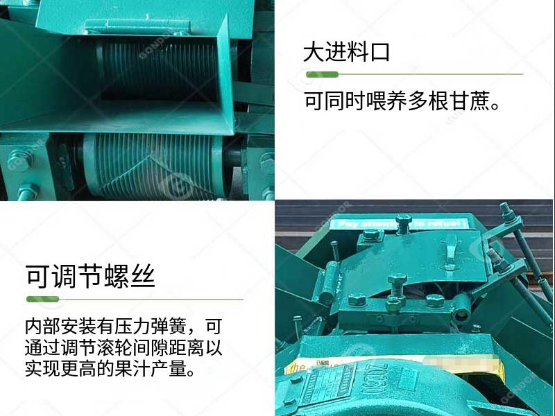 进料口和出料口两侧均安装了可调节螺丝,内部装有压力弹簧,可以调节辊隙距离,从而获得更高的出汁率。