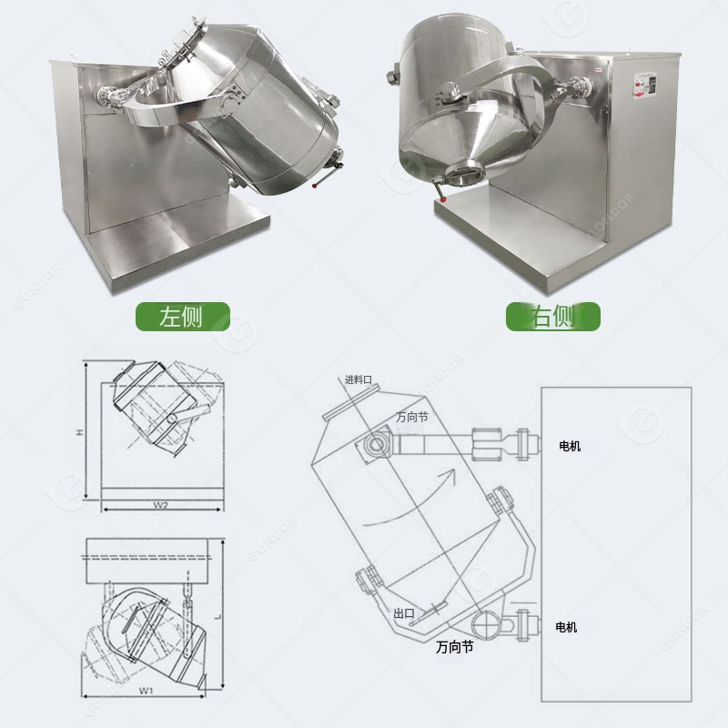 3D粉末混合机是一款高效、安全、稳定的混合设备,专为化工、食品、冶金和科研行业设计。它采用304不锈钢材质,外观时尚,筒体内壁光滑,360°无死角设计,混合率高达99.9%。该混合机利用三维摆动原理,使物料在筒体内往复运动并均匀扩散。此外,该三维混合机配备智能定时功能和可靠的电子控制系统,操作简便,适用于工厂和车间。其大功率电机和坚固的传动轴协同工作,确保设备高效稳定运行。